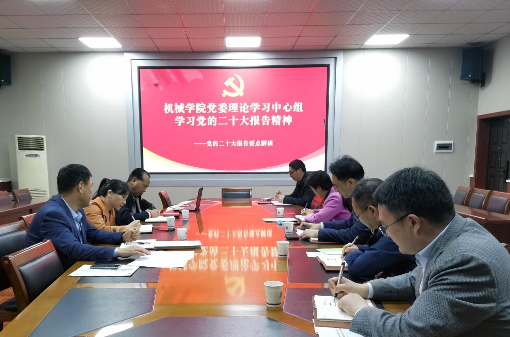 院党委书记聂凯表示,党的二十大是在全党全国各族人民迈上全面建设社会主义现代化国家新征程、向第二个百年奋斗目标进军的关键时刻召开的一次十分重要的大会。作为拥有全国党建工作“样板支部”并积极创建河南省党建工作“标杆院系”的基层学院,将深入学习贯彻党的二十大精神,以习近平新时代中国特色社会主义思想为指导,全面贯彻党的教育方针,落实“立德树人”根本任务,牢记“为党育人、为国育才”时代使命,以“高质量发展”为目标、以“高质量党建”为引领,构建以“办学体系、考核体系、文化体系、党建体系”为内容的现代学院治理体系,充分激发内生动力和发展活力,为推进学院高质量发展提供强大的价值引导力、文化凝聚力、精神推动力、目标牵引力、工作执行力、成功自信力,为学校实现“双一流”创建目标提供机械智慧、展现机械力量、做出机械贡献。