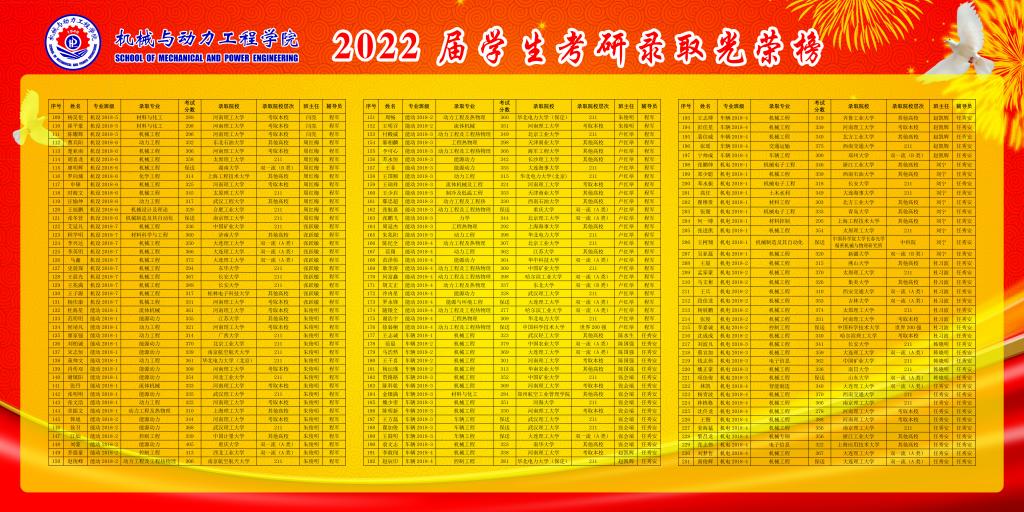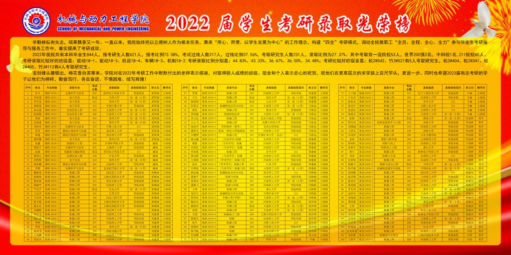 共有本科毕业生844人,报考研生人数621人,报考比例73.58%,考试过线人数317人,过线比例37.56%,考取研究生人数231人,录取比例为27.37%。其中考取双一流院校53人,世界200强2名,中科院1名,211院校60人。考研录取比较好的班级是:能动18-1、能动18-3、机设18-4、车辆18-3、机制18-2,考研录取比例分别是:44.83%、43.33%、36.67%、36.00%、34.48%;考研比较好的宿舍是:松2#542、竹3#521有5人考取研究生,松2#404、松2#341、松2#405、竹3#112有4人考取研究生。