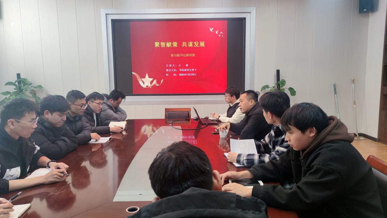 于12月6日在203会议室召开了“聚智献策 共谋发展”座谈会。本次座谈会由党委副书记王帅主持,与研究生骨干进行了面对面的交流和探讨,旨在提高研究生骨干思想站位,端正工作态度,明确具体职责,助力学院发展。