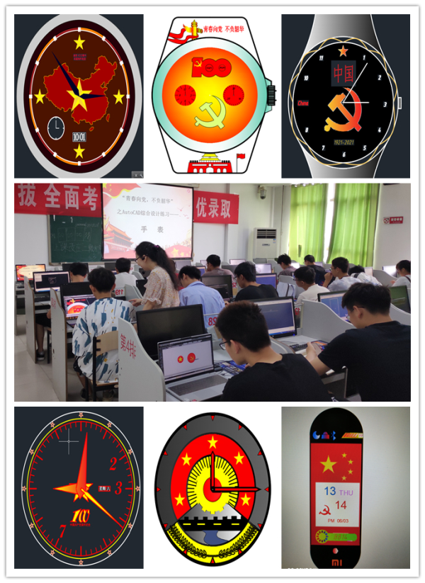 活动要求以“青春向党 不负韶华”为主题,综合应用计算机绘图软件AutoCAD所学知识,设计一款尺寸大小基本符合佩戴要求的手表,将手表的图形文件和截图上传至云班课。活动现场,全体学生凝神贯注,充分发挥自己的想象力,将华表、党徽、天安门、党旗、麦穗、中国版图、齿轮等元素有机融合到图形设计,用鼠标和键盘记录设计理念,用专业知识表达对党的热爱之情。有的以水墨画风格设计,以横向形似长城的齿条与齿轮啮合,象征着中国在世界最耀眼的地方飞速发展,以九曲连环的黄河象征着中国源远流长的民族文化和磅礴气势;有的以五星红旗元素设计,象征着中国只有在中国共产党的领导下,走中国特色社会主义道路才能蓬勃发展;有的以银灰色色彩设计,象征中华大地外的茫茫银河和中国对宇宙探索和科技强国的高度重视;还有的以金黄色的中华大地和麦穗,象征中国人民的大丰收和中国对来之不易和平的珍惜...小廿廿们尽情享受着绘图在双手升华的喜悦感和成就感。活动结束后,网络投票评选出10幅设计作品,颁发“智绘达人”奖。