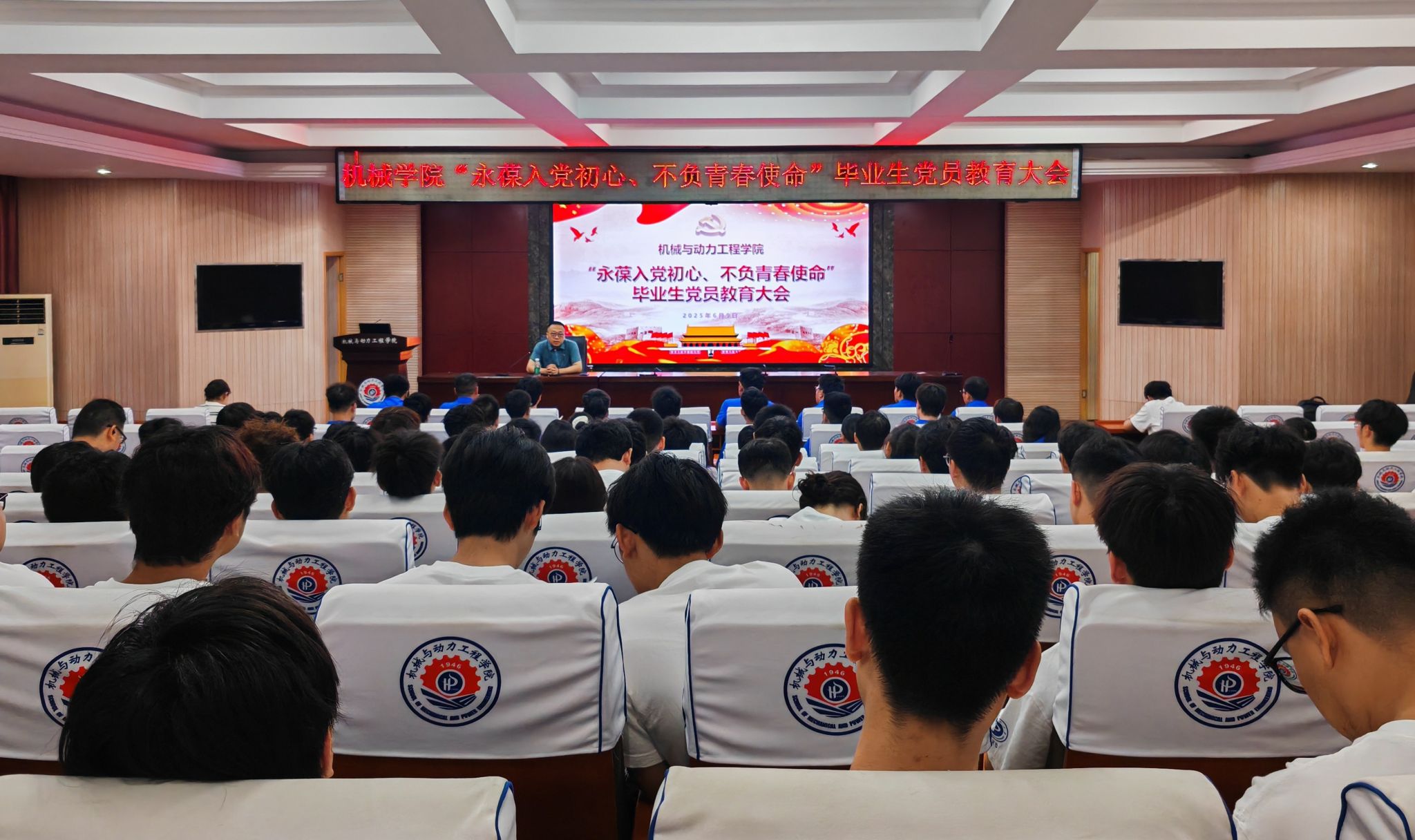 王帅以《永葆初心担使命 青春建功新征程》为题,为毕业生党员讲授毕业前 "最后一堂党课"。他以焦裕禄同志 "生也沙丘,死也沙丘" 的入党初心为引,结合毛泽东同志 "为人民服务" 的信仰内核,立足百年变局下共产党员的时代使命,从 "信仰之基、为民之心、担当之责、廉洁之守" 四个维度,系统阐释共产党人的修养要义。他着重提到:“走出校园后,无论身处科研一线、企业车间还是基层岗位,都要以 ' 我将无我 ' 的境界践行 ' 不负人民 ' 的誓言,把‘明德任责’校训与‘好学力行’校风融入血脉,在新岗位续写 ' 机械先锋 ' 的奋斗故事,为党旗增辉,为母校添彩!”
