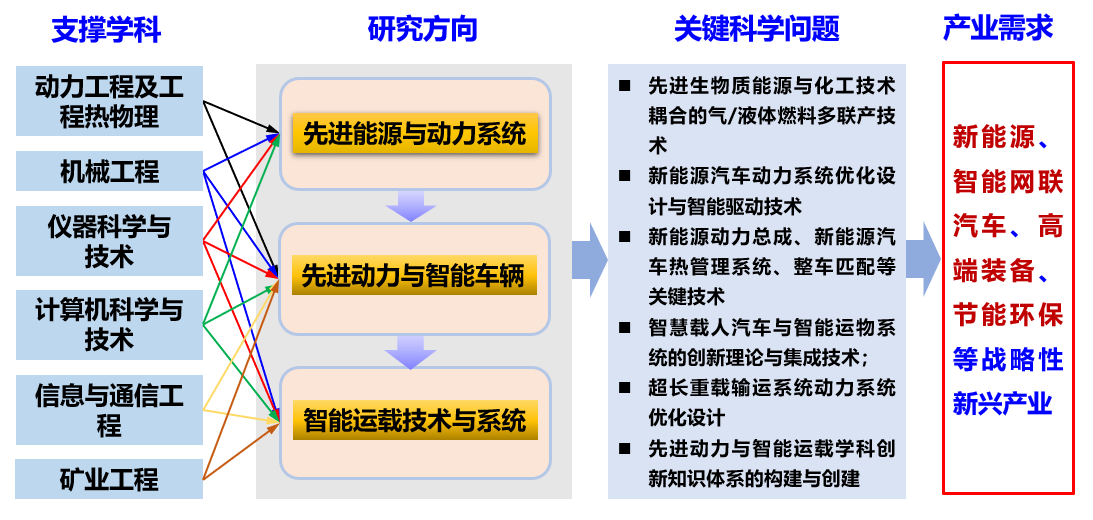 先进动力与智能运载河南省新兴交叉学科于2023年12月由河南省教育厅确定立项。学科植根于深厚的能源发展底蕴,面向国家和区域发展战略规划,立足新能源、新动力,发展新一代智能运载装备,在汽车智能网联、装备智能制造、复杂条件下物料输送等领域为国家发展需求提供重要技术支撑。交叉学科融合能源、机械、计算机、通信、测控、矿业工程等学科领域(其中机械工程、矿业工程为一级博士学位授权学科,动力工程及工程热物理、仪器科学与技术、计算机科学与技术、信息与通信工程等均为河南省一级重点学科),聚焦先进能源与动力系统、先进动力与智能车辆、智能运载技术与系统等三大方向开展研究,以实现能源供给绿色强劲动能、动力驱动高效智能、运载安全低耗智慧,引领区域能源动力与运载运输学科领域及产业的创新发展。